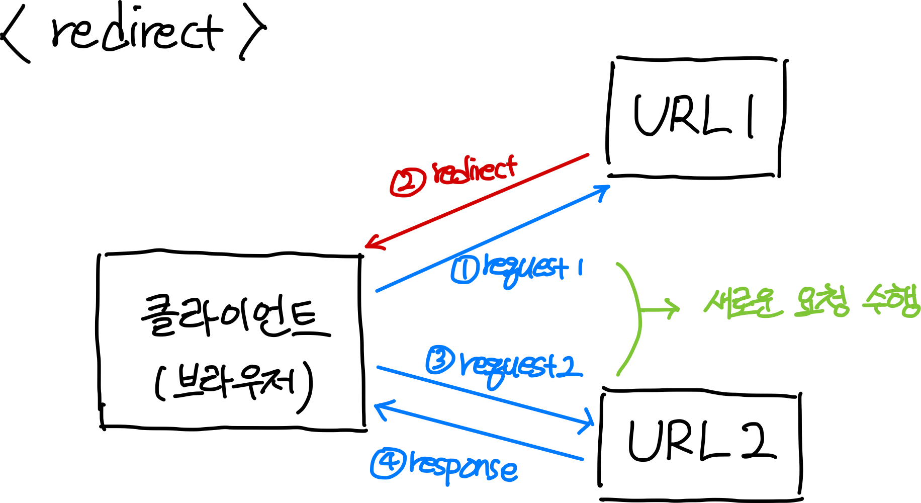 redirect 명령이 들어오면 웹 브라우저에게 다른 페이지로 이동하라는 명령을 내린다. 이후 웹 브라우저는 URL을 지시된 주소로 바꾸고 그 주소로 이동한다. (request2)