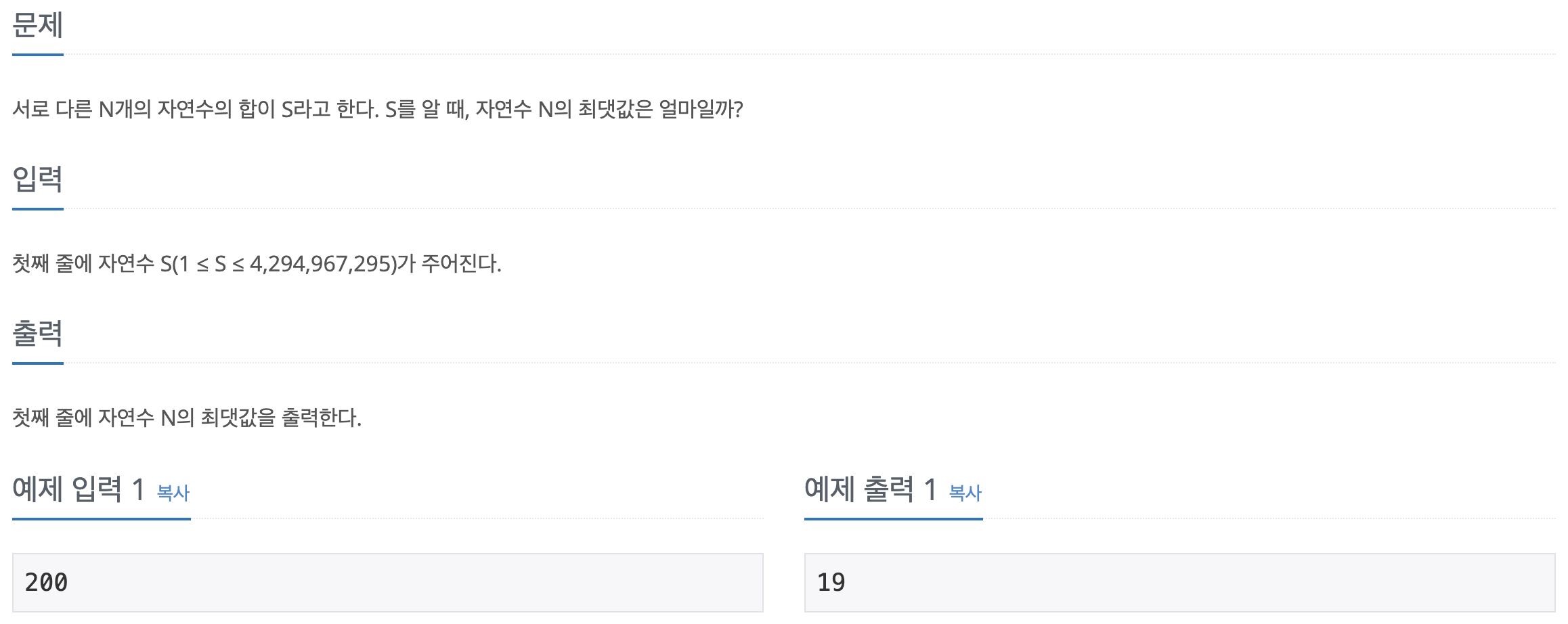 - S의 조건 (1 <= S <= 4,294,967,295) 이므로 int 의 범위를 벗어남. -> Long 사용