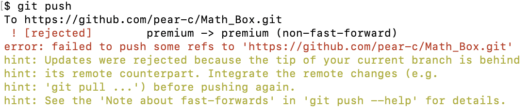 이 상황에서, 나는 리모트 레포지토리가 수정된 지 모르고, git add . 후 git push 하려 했다. 그랬더니, 아래 처럼 오류가 발생했다.