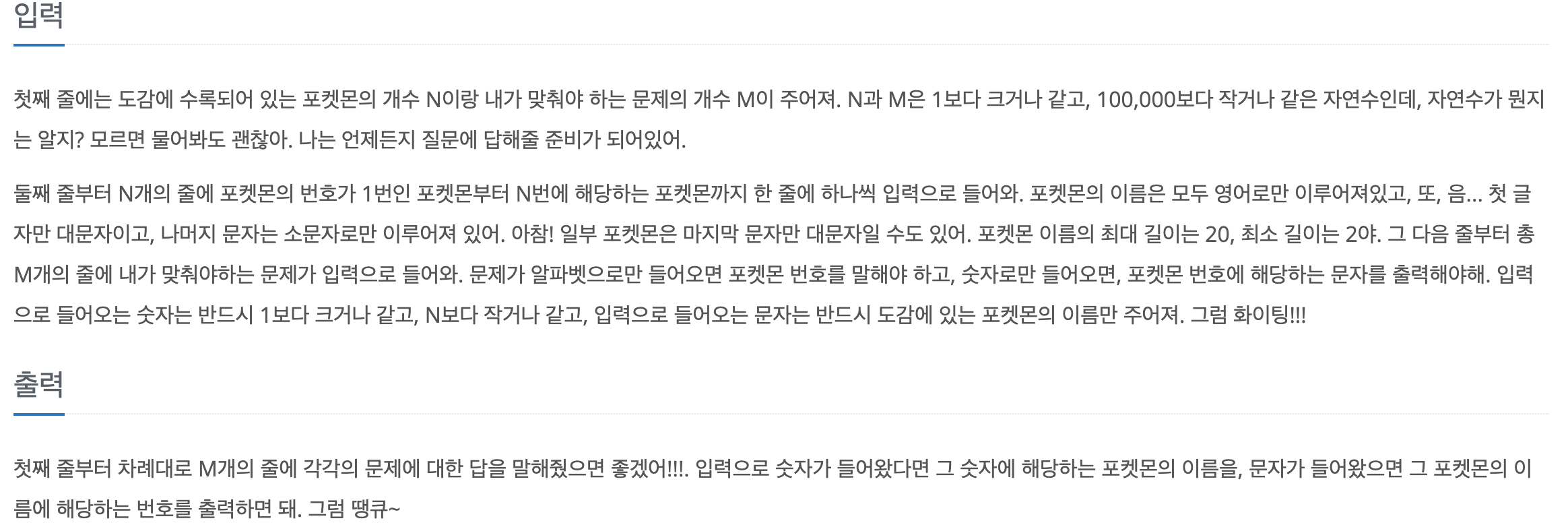 문제의 서론이 너무 길어서 처음에 다소 문제를 이해하기 어려웠으나, 본질적인 문제는 'N만큼 포켓몬을 입력받은 후 M개의 문제의 답을 출력하라' 였다. 여기서 입력하는 포켓몬은 String 이였고, M개의 문제는 (포켓몬 이름 or 도감번호) 둘 중 하나인데, (포켓몬이름 -> 도감 번호 출력) / (도감 번호 -> 포켓몬이름 출력) 두가지 형태로 출력하는 것이다.