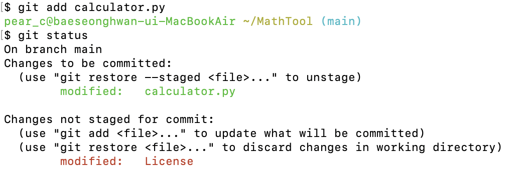 현재 git에 calculator.py와 License 두 파일이 있으므로, git add calculator.py 만 실행 후 git status를 실행한 결과