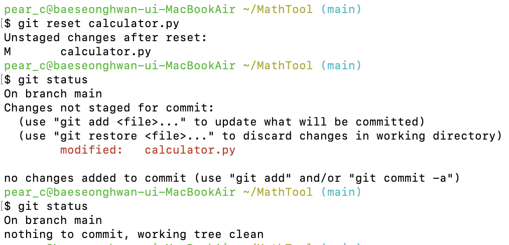 calculator.py 파일 내용이 변경된 상황에서, git add 했다가 git reset 한 상황