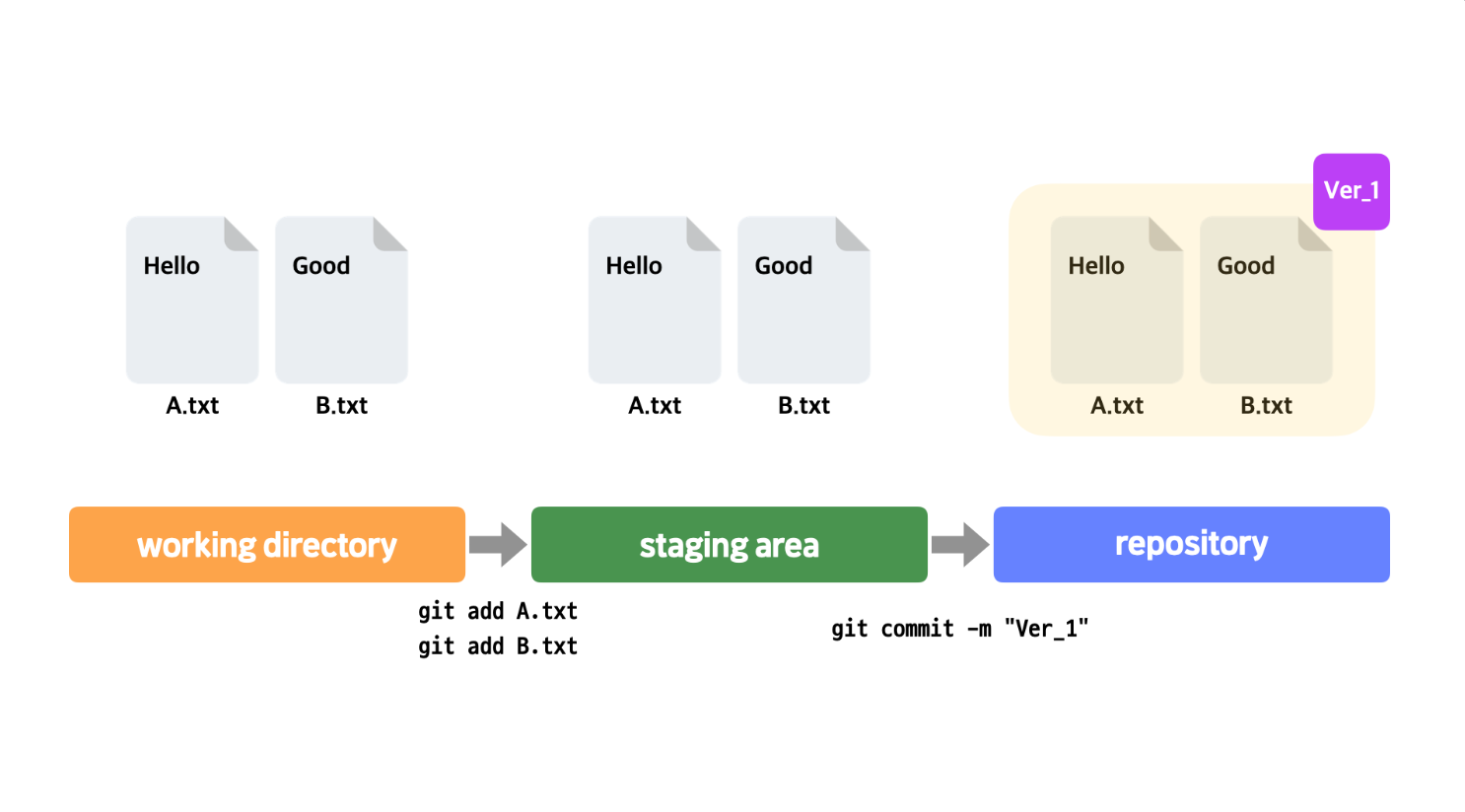 2. git add A.txt, git add B.txt 실행하여 두 파일을 staging area로 올림
